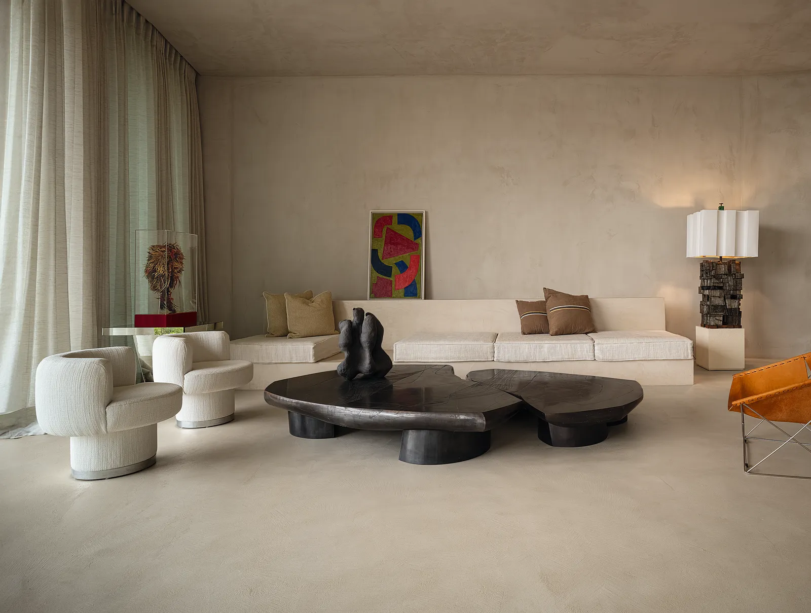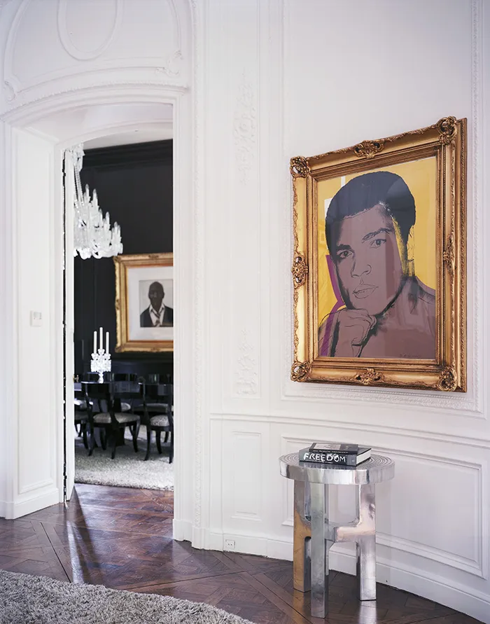 Roxie, comme le nom de la mère de Lenny Kravitz, est une villa d’inspiration rock chic nichée dans la campagne française. Le musicien, qui est également designer, a conçu chaque espace avec un sens inné du style et une attention méticuleuse aux détails. Les lignes sont épurées, les matières nobles, et l’atmosphère intime. Ici, ce sont les canapés Togo de Michel Ducaroy, les commodes de Paul Evans, les pièces de Gabriella Crespi, Ado Chale, Karl Springer, Philippe Hiquily ou Joe Colombo qui investissent la plupart des espaces, du salon à l’escalier monumental. Celui-ci accueille en son sommet « le monstre », l’une des plus belles œuvres de Paul Evans, à laquelle le chanteur a donné ce surnom et qui le suit depuis quelques années déjà.