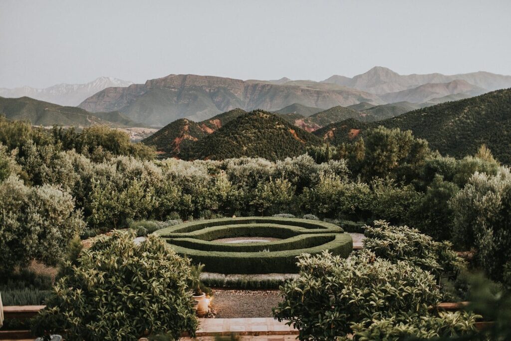 Pour une évasion totale, direction Kasbah Bab Ourika, à seulement 35 minutes de Marrakech, dans le cadre idyllique de la vallée de l’Ourika. Nichée au cœur des montagnes, la retraite dévoile une piscine à débordement entourée d’oliviers et de citronniers, avec vue imprenable sur l’Atlas. Quant aux jardins, ils mêlent buis finement taillés et myriade de rosiers. Immanquable.