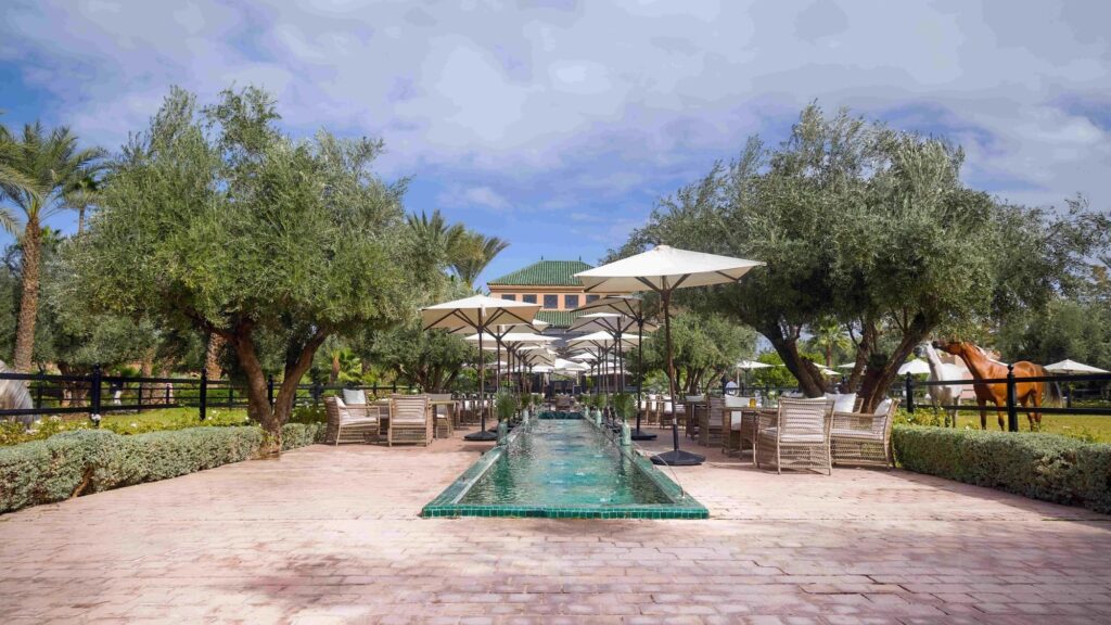 Propriété de la famille Bennani Smires, l’hôtel Selman Marrakech est une adresse à ne pas manquer. Installez-vous pour un brunch somptueux en plein air tout en admirant une parade équestre dans les magnifiques jardins de l’hôtel. Le buffet mêle spécialités méditerranéennes et marocaines : couscous, tajines, et un assortiment généreux de pâtisseries allant du Saint-Honoré au Paris-Brest. Le cadre, signé Jacques Garcia, associe des lustres en verre de Murano, du velours carmin et des éléments traditionnels marocains.